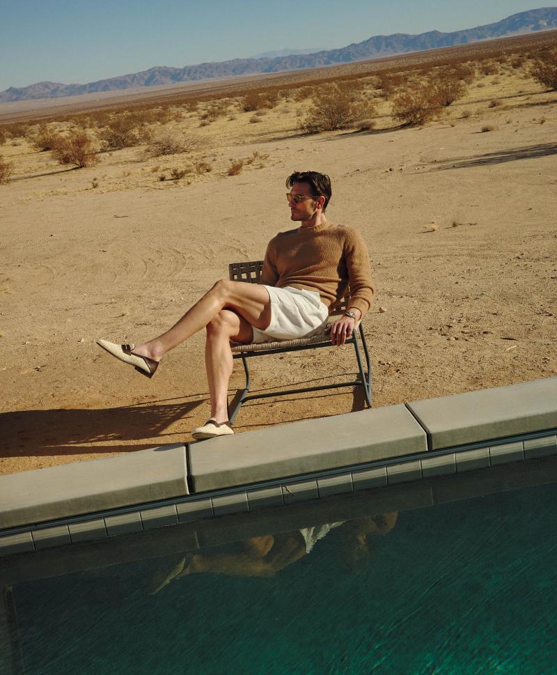 كنزة من صوف ميرينو والكشمير من توم سويني (595 دولارًا)، وسروال قصير من الكتان من برونيللو كوتشينيللي (650 دولارًا)، وحذاء خفيف من الجلد وألياف الرافيا من مانولو بلانيك (895 دولارًا)، ونظارات شمسية من Leisure Society (1,185 دولارًا)، وساعة Chronomaster Revival مشغولة في علبة من الفولاذ بقطر 37 ملليمترًا من زينيث (8,700 دولار).