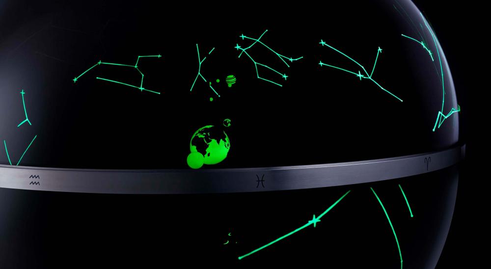 عبر الكرة الزجاجية للساعة، يطلّ مجسم الأرض من المركز وحوله الشمس والقمر والمشتري وأقماره الأربعة، وتسترشد حركة هذه الأجرام بآلية حركة ميكانيكية، معززة بوظيفة التقويم الدائم وتنطوي على ثمانية براميل تؤمّن الطاقة اللازمة لتحريك المكوّنات من دون انقطاع طيلة 40 يومًا. كما تتعزز هذه الآلية بميزة الارتداد التي تُحاكي الحركة التراجعية للكواكب على ما تُرى من الأرض.