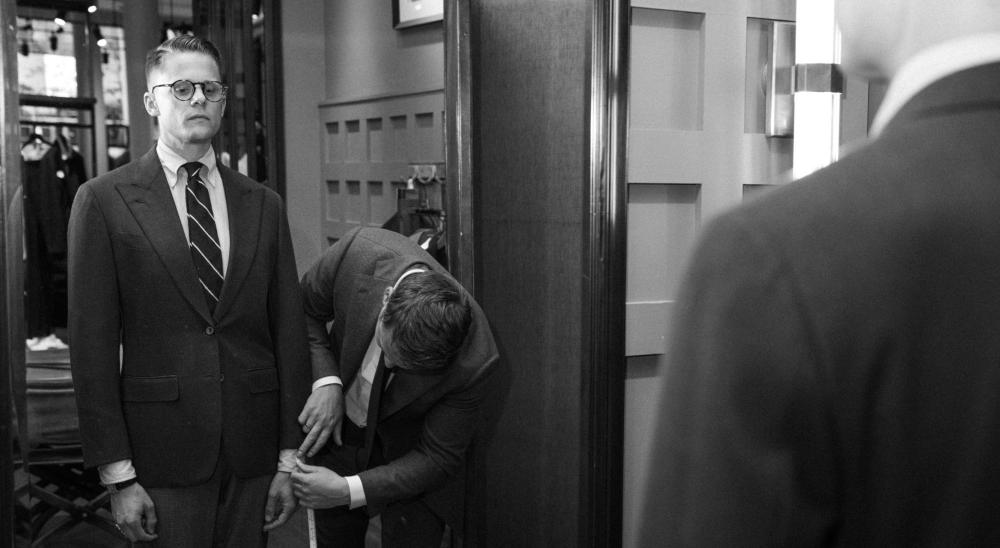 بعدها تأتي عملية أخذ المقاسات، وخلالها أجرّب عيّنةً بمقاسين مختلفين، يُناسبني منهما المقاس الأكبر. تُثبّت الحائكة القماش الزائد، كما تُراعي سِماتي الجسدية مثل كتفي الأيمن المتدلي، وتُحدد الفسحة المثالية للياقة (أَقبل بالقاعدة التي يقترحها البائع لجهة إفساح ما مقداره إصبع واحد). وبذلك أَختتم زيارتي إلى ركن سارتوريا، فأتجه إلى وسط المدينة قاصدًا متجر توم سويني.