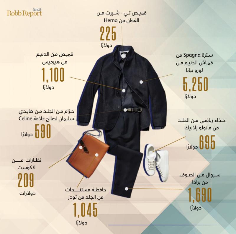 سترة Spagna المصنوعة من قماش الدنيم من لورو بيانا (5,250 دولارًا)، وقميص من الدنيم المصبوغ باللون النيلي من هيرميس (1,100 دولار)، وقميص تي - شيرت من القطن من Herno (225 دولارًا)، وسروال من الصوف من برادا (1,690 دولارًا) وحزام مصنوع من جلد العجول من هايدي سليمان لصالح علامة Celine (590 دولارًا)، وحافظة مستندات من الجلد من تودز (1,045 دولارًا)، ونظارات بإطار معدني من لاكوست (209 دولارات)، وحذاء رياضي من جلد العجول من مانولو بلانيك، (695 دولارًا).