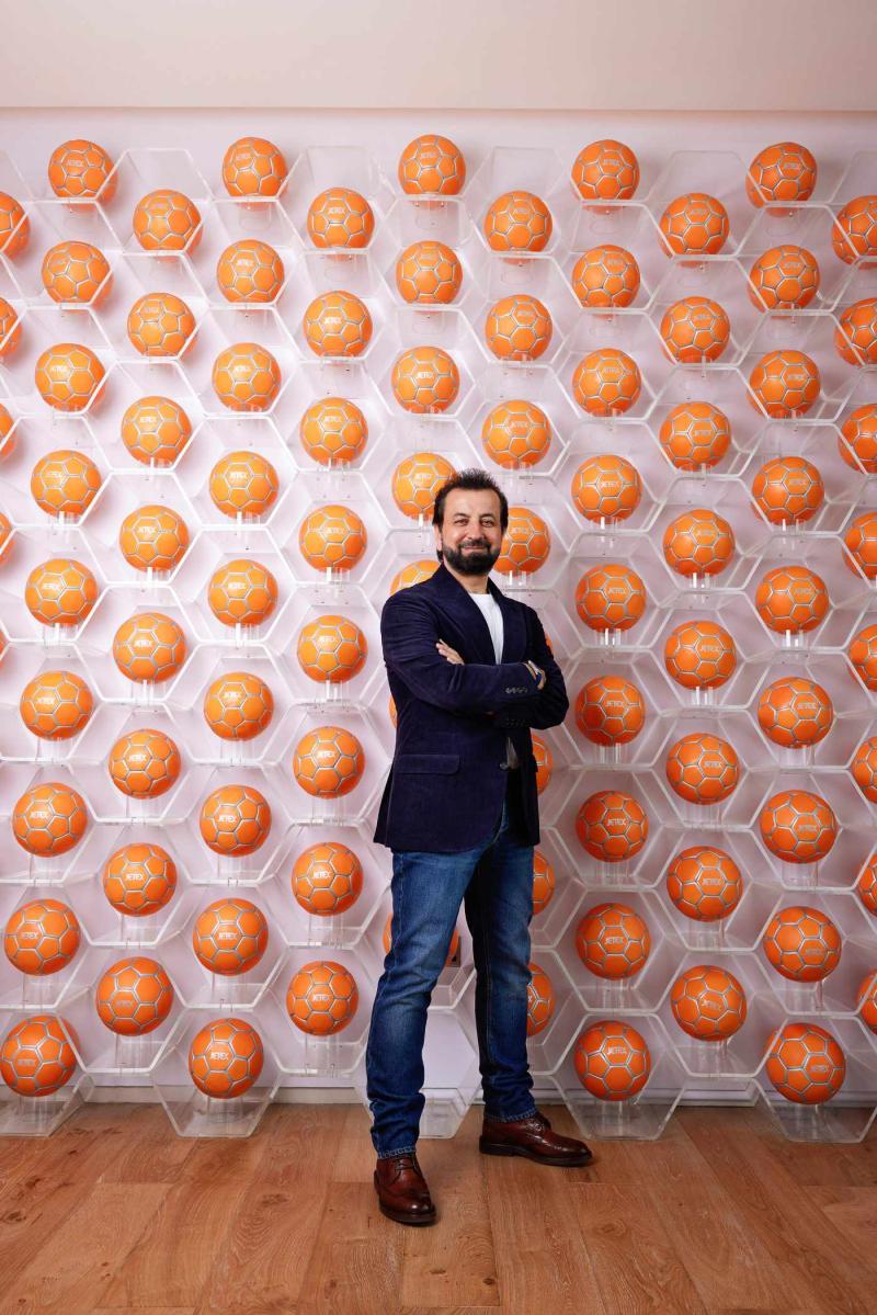 أمام جدار يتزيّن بكرات القدم في Jetex دبي، محطة الطيران الخاص الرئيسة لنقل المسافرين إلى مباريات كأس العالم في قطر لاحقًا هذا العام.