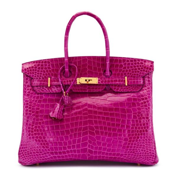 حقيبة هيرميس Porosus Crocodile Birkin 35 من عام 2014، حيكت من جلد التماسيح باللون الزهري اللامع وأثرتها تفاصيل من الذهب (50 ألف دولار).