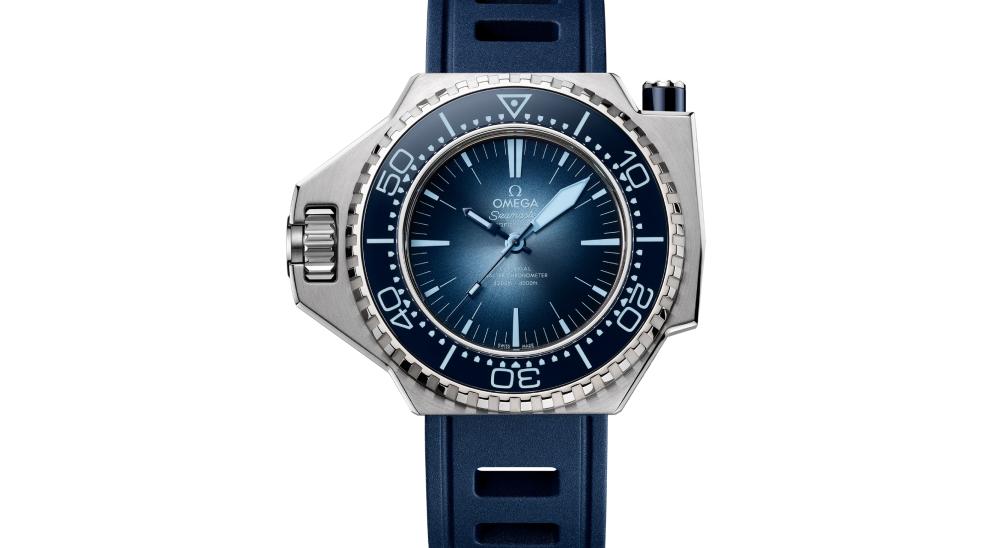 يذكر أن ساعة Omega Seamaster Ploprof 1200M تكتمل بحزام مطاطي أزرق اللون.