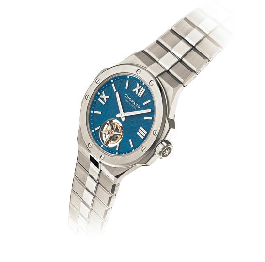 في ساعة Alpine Eagle Flying Tourbillon، التي تحمل شهادة الكرونوميتر ودمغة جنيف للجودة، والمشغولة في علبة بقطر 41 ملليمترًا من فولاذ Lucent Steel A223 (الذي طورته شوبارد من خلال عملية إعادة صهر فائقة الدقة)، يبرز التوربيون المحلق عند مؤشر الساعة 6 ليضفي مزيدًا من الثراء على الميناء أزرق اللون المشغول من الذهب الخالص والذي تحاكي زخارفه قزحية عين النسر.