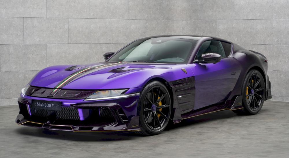 التعديل شمل أيضًا إطلاق عجلات Mansory VF.5 الخاصة، بقياس 21 بوصة في الأمام و22 بوصة في الخلف، ليكتمل المشهد بلون خارجي بنفسجي غني تتخلله لمسات سوداء وألياف كربون، مع خط مركزي أنيق يحمل ألوان العلم الإيطالي.