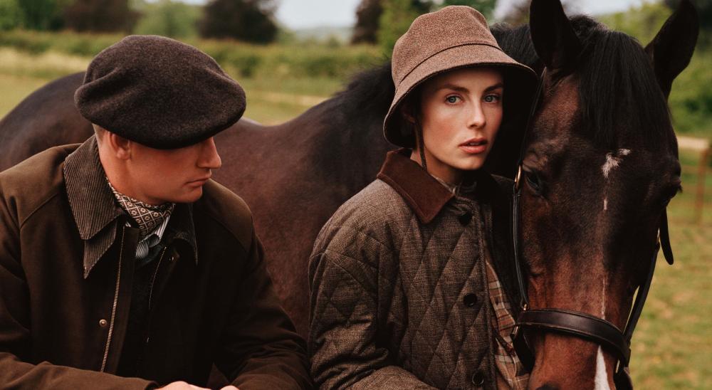 سترة Traveller Field Jacket، حيكت من الحرير والكتان، وسترة Vade المشغولة من صوف غرافين، وسروال Rouen المشغول من الألياف الدقيقة والإيلاستان، وقبعة Alma المشغولة من اللباد، وحذاء Horseriding High Boot المصنوع من جلد العجول الناعم واللامع.