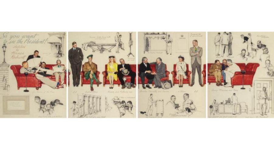 أربع لوحات نادرة لنورمان روكويل، المستوحاة من البيت الأبيض والحرب العالمية الثانية، تُعرض في مزاد هيريتدج، مجسدة الفن والسياسة في قالب تاريخي. اقرأ المزيد