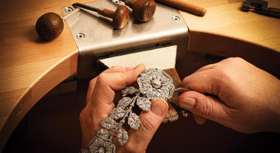 أحد فناني كارتييه يعمل على مشبك من البلاتين والألماس من عام 1929.