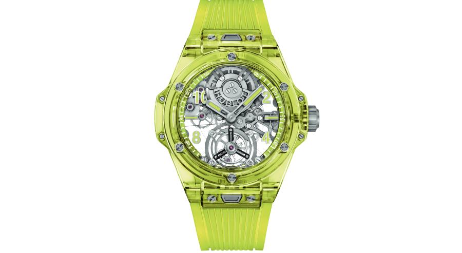 تثبت ساعة The Big Bang Tourbillon Yellow Neon SAXEM المصنوعة من أكسيد ألمنيوم الياقوت ومعادن أرضيّة مختلفة لتحقيق لونها الأصفر الوهاج تفوّق دار هوبلو في...