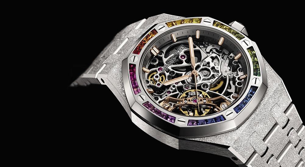 لطالما شكلت أقراص الساعات التي تغلب عليها ألوان قوس قزح آخر الصيحات السائدة في صناعة الساعات، وقد تفوقت أوديمار بيغيه في المنافسة. فقرص الساعة لديها الذي تزينه ألوان قوس قزح (يحفل بما مجموعة 32 حجرًا من الياقوت زنة 2.24 قيراط ذات قطع مستطيل) يزين علبة جليدية المظهر قطرها 37 ملليمترا مشغولة من الذهب الأبيض، تحيط بميناء مخرم ومعقد التفاصيل يزدان بآلية عجلة توازن مزدوجة من الذهب. على الرغم من سعرها الباهظ، وهي تستحق لتفاصيلها المذهلة، فلتكن مطمئنًا إلى أنه يمكنك أن تحصل في يوم من الأيام على مبلغ مالي أعلى مما دفعت إذا ما رغبت في ذلك (سعرها 104٫600 دولار).