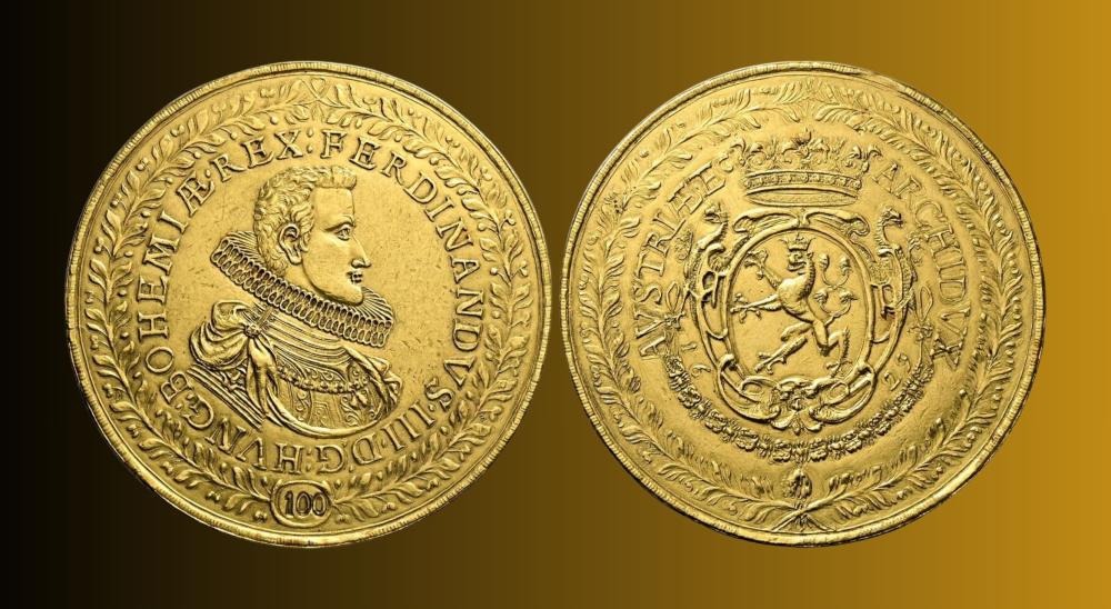 تتصدر هذه المجموعة النادرةعملة ذهبية عملاقة من فئة 100 دوكة أصدرها الإمبراطور فرديناند الثالث عام 1629، منقوشة بملامحه مرتديًا درعًا حربيًا وياقة زخرفية على شكل خلية نحل، رمزًا للقوة والتنظيم.