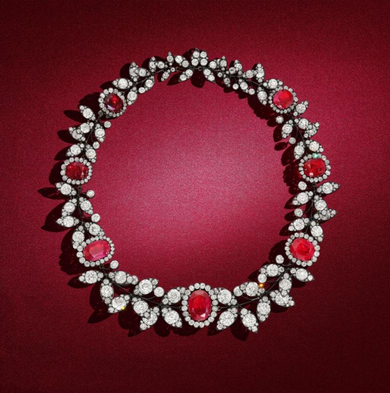 قطعة أخرى تستوقف الأنفاس، هي عقد مستوحى من أوراق الغار، تحفة كلاسيكية قدّمتها دار بوشرون، يلتقي فيها الياقوت الأحمر الفاخر ببريق الألماس في تكوين فني يُقدَّر سعره بين مليون ومليوني دولار أمريكي، ويُعدّ من أبرز ما سيُعرض في المزاد.