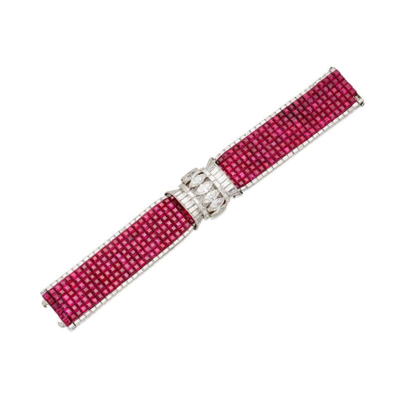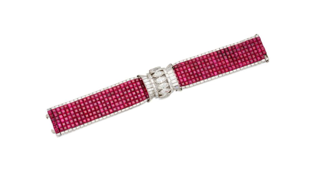 وتتجلّى الحِرَفية المتناهية في سوار نادر من توقيع كارتييه، صُمّم باستخدام تقنية الترصيع غير المرئي التي تتطلب دقة متناهية، فتبدو الأحجار كأنها تطفو من دون إطار في إنجاز بصري وتقني لا يُضاهى.