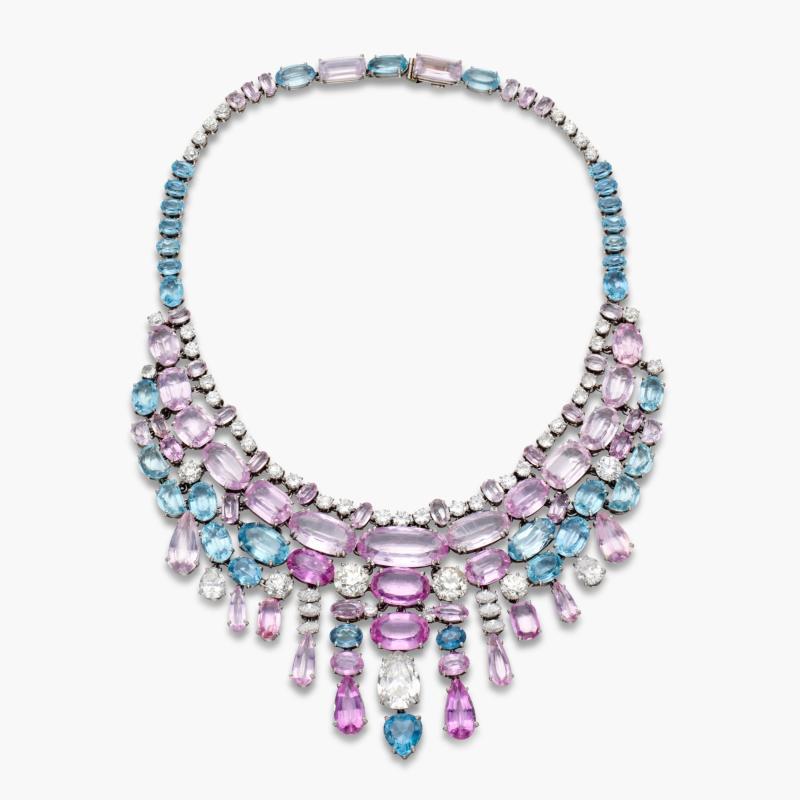 من أبرز المعروضات قلادة متعددة الألوان صاغتها المبدعة سوزان بيلبيرون التي تركت بصمة لا تُمحى في عالم الجواهر الفرنسية. تتألق القلادة بتوليفة آسرة من التوباز الوردي، والألماس، وأحجار كريمة أخرى، في تصميم يجمع بين القوة والنعومة في آن واحد.