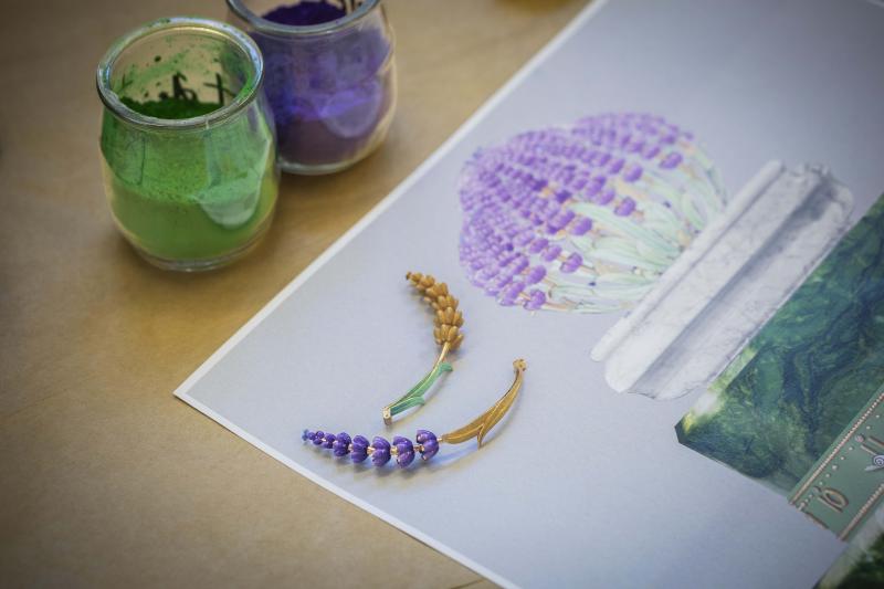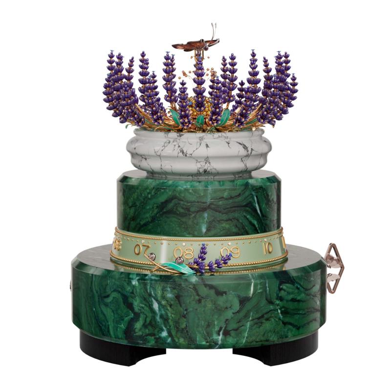 بعد 2,070 ساعة من العمل الحِرَفي في صياغة الجواهر، و1,400 ساعة لبناء آلية الحركة وتجميعها، اكتملت التحفة. تبدأ سيقان الخزامى بالتفتح والتموّج تدريجيًا لتُحاكي تأثير الأزهار وهي تتراقص في مهبّ النسيم، فيما ترتفع الفراشة المركزية، المزدانة بطلاء المينا والألماس والجمشت وحجر عين النمر، وتحلّق بأجنحتها في حركة دائرية مبهرة.