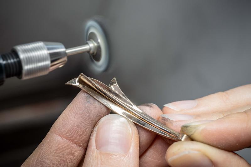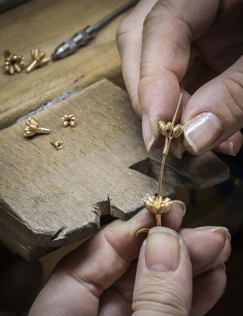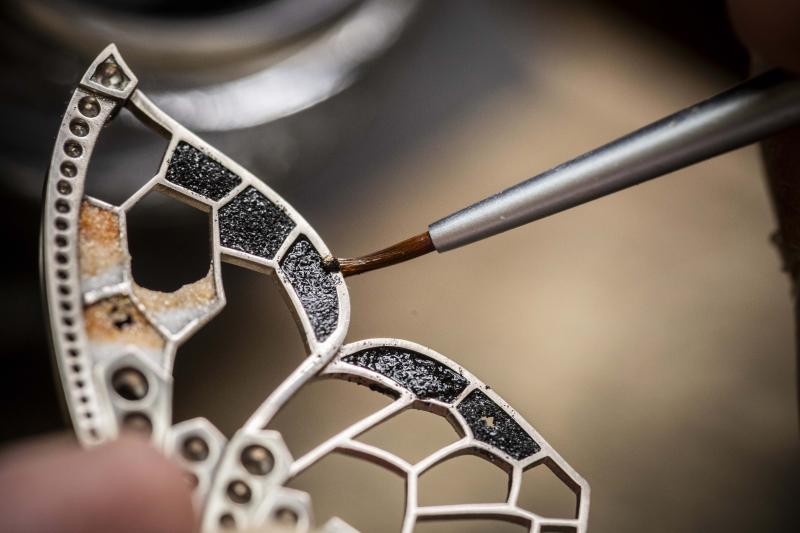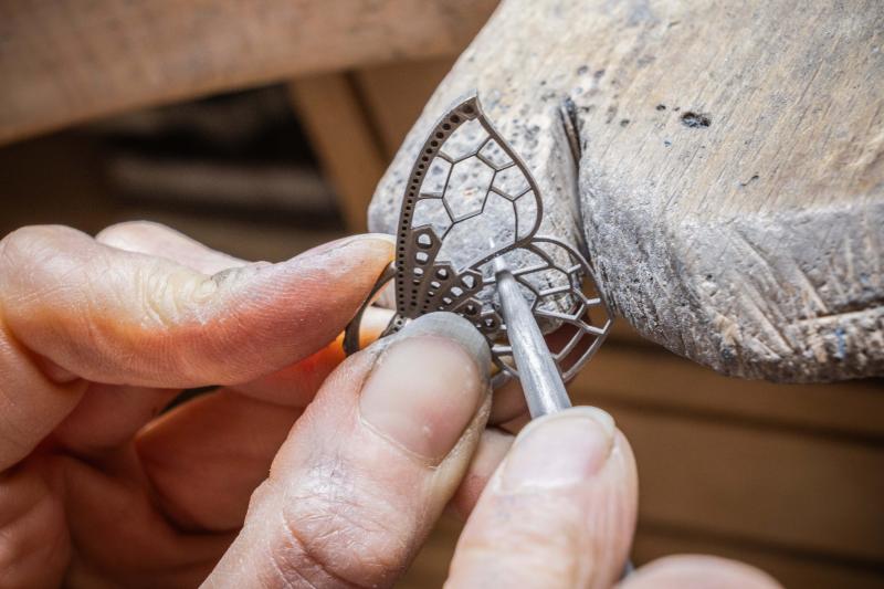 يعمل أحد الحرفيين على صقل أحد جناحي الفراشة المصنوعين من الذهب الأبيض عيار 18 قيراطًا، تمهيدًا لتطعيمه بالألوان والأحجار الكريمة.