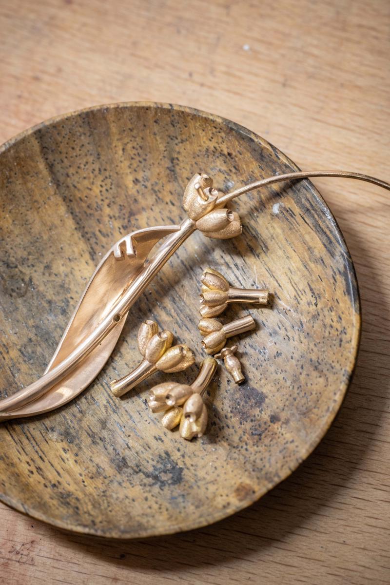 نظرًا لحجمها الصغير، لا بد أن تُشكَّل عناصر ساق الخزامى وتُصقل يدويًا على يد حرفي ماهر. أما براعم التويجات، فتُشكّل باستخدام أداة خاصة تمنح أطرافها شكلًا مقعّرًا.