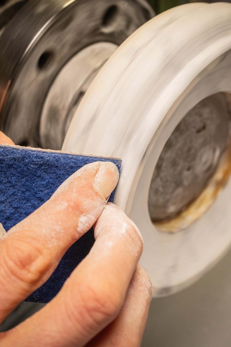 في هذه المرحلة، تُصقل قاعدة الساعة، المصنوعة من حجر الهاوليت، والتي تحتضن سيقان الخزامى، باستخدام عجلة تلميع. أما الجزء السفلي من القاعدة، فمصنوع من حجر الفيرديت الأخضر. ويُعد اختيار القطعة المناسبة من هذا الحجر مهمة بالغة الصعوبة لضمان الحفاظ على تجانس لونها حتى بعد تشكيلها على هيئة أسطوانة.