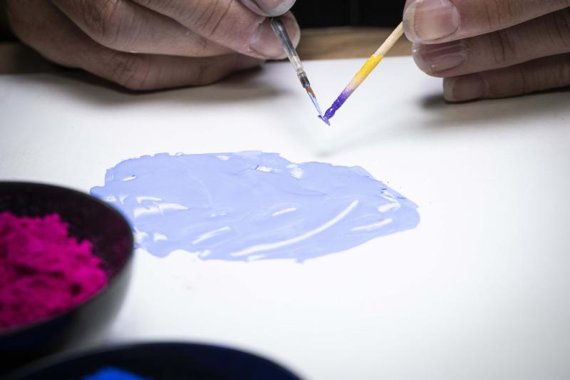 الزهور الزرقاء في أعلى كل ساق صغيرة للغاية، ما يستدعي زخرفتها بالكامل يدويًا. يقول برنارد موضحًا: "نستخدم طلاء اللَّك الذي يُطبّق باستخدام فرشاة".