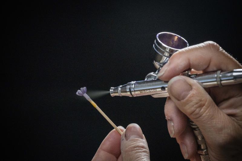 كاثرين نيكولا، الحرفية المعروفة والحائزة لقب أفضل حرفي في فرنسا، تتولى رش كل واحدة من التويجات (عددها 270 تويجًا) باستخدام أداة الرش الهوائي. يقول برنارد: "نحب العمل معها لأنها على الأرجح الأفضل في هذا المجال على الإطلاق". تلوّن نيكولا أيضًا أوراق الخزامى باللون الأخضر.
