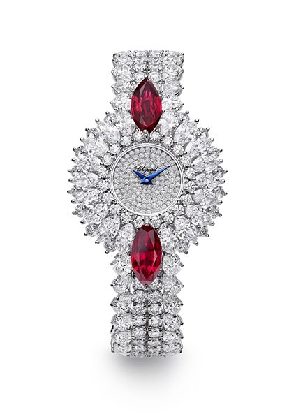 ساعة مشغولة في علبة من الذهب الأبيض يغتسل سوارها والميناء ببريق الألماس، ويثري ترصيعها الثلجي حجران من الياقوت الأحمر.