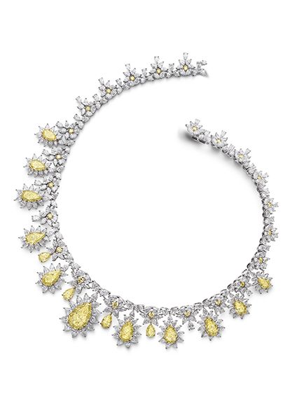 عقد من الذهب الأبيض يحتضن ترصيعه الألماسي الأبيض حبيبات من الألماس الأصفر تتبعثر في محيط خمس عشرة ألماسة باللون الأصفر الواضح صيغت بالقطع الإجاصي.