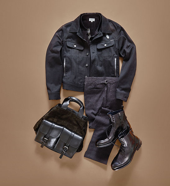 سترة من القطن من توم فورد (السعر 2,590 دولارا)، وقميص بولو من الكشمير والحرير من بريوني (السعر 975 دولارا)، وسروال صوف من ريتشارد جيمس (جزء من بذلة، السعر 1,040 دولارا)، وحذاء جلدي برقبة من بريوني (السعر 1,500 دولار)، وحقيبة تسوق من الجلد المقلوب تزينها تفاصيل من الجلد الناعم من جورجيو أرماني (السعر 3,095 دولارا).