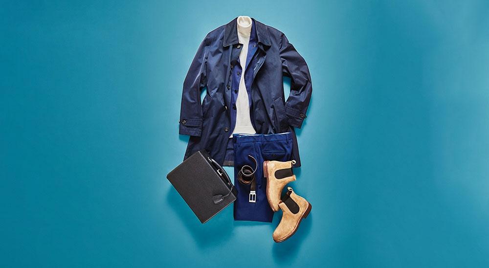 الصورة في الأعلى: معطف واقٍ من المطر مشغول من الحرير من بريوني (السعر 1,500 دولار)، وسترة من الصوف من لارديني (جزء من بذلة، السعر 1,450 دولارا)، وكنزة بياقة مرتفعة محبوكة من الكشمير والحرير من غابرييلا هيرست (السعر 790 دولارًا)، وسروال مشغول من القطن والنايلون والإيلاستاين من L.B.M. 1911 (السعر 295 دولارًا)، وحذاء برقبة من الجلد المقلوب من برونيللو كوتشينيللي (السعر 895 دولارًا)، وحقيبة مستندات من الجلد من مارك كروس (السعر 2,295 دولارًا)، وحزام من مون بلان (السعر 290 دولارًا).