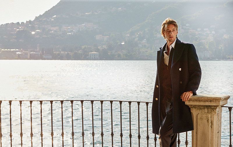 معطف وسروال من الكشمير من بريوني، وسترة من الكشمير والصوف ووشاح من برينغل Pringle، وحذاء من جلد العجول من برونو ماغلي، وساعة يد Radiomir Art Deco Special Edition 47 mm ذات الرقم المرجعيPAM0791 من بانيراي.